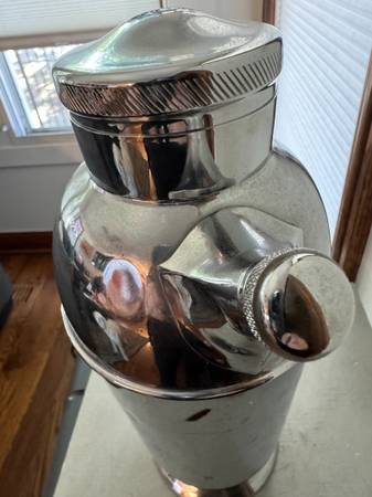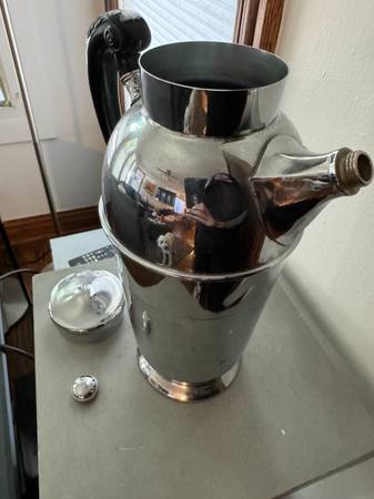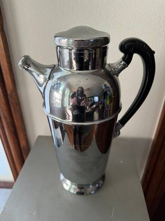 A classic art deco-style cocktail shaker/pitcher Vintage 50s Krome Kraft Farber Brothers with a black bakelite handle. Designed and produced by Farber Bros of New York as part of their Krome Kraft line of beverage ware. Great traditional pitcher design holds 42 ounces of your favorite cocktail or other party beverage. It has a great pour spout with a secondary lid.