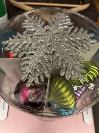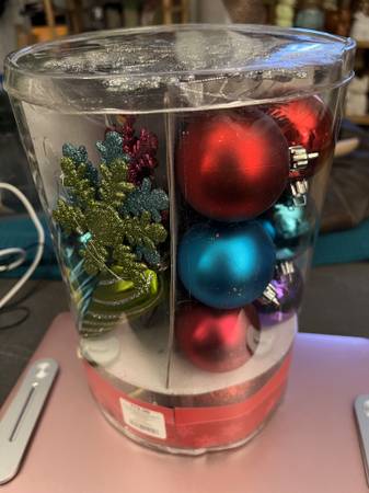 This is a set with several colorful and some glittery ornaments that won't shatter. Super bright and pretty.