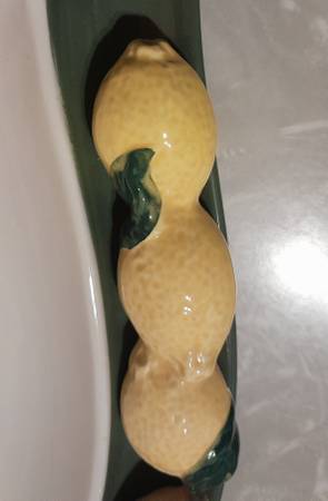 Two available at $50 each. Mid Century platter with a lemon motif is 12 3/4"x13". Has no chips, cracks or crazing.