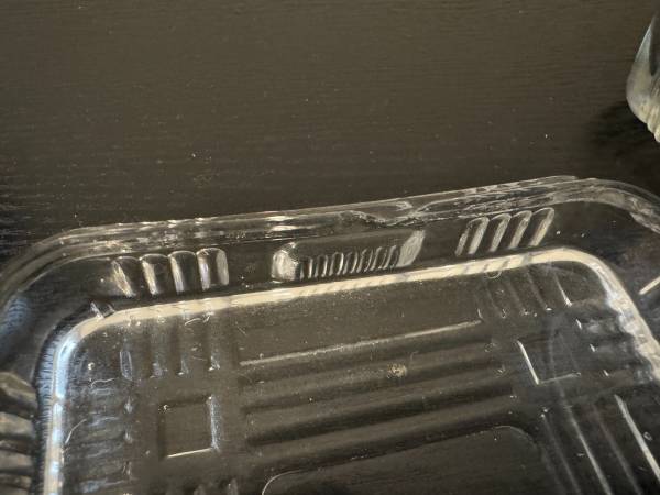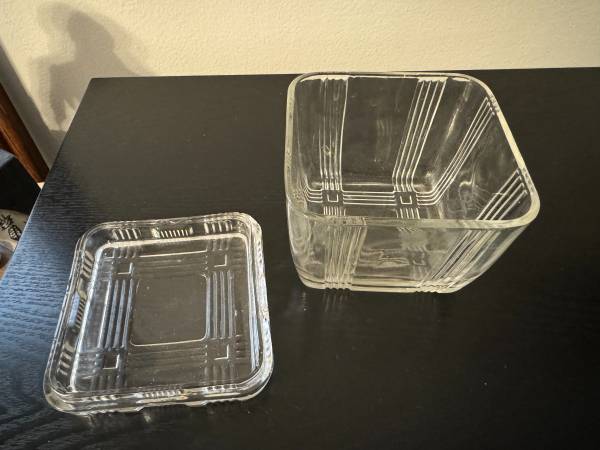 Small Federal Glass and Hazel Atlas Antique Refrigerator Dish with a crosshatch pattern. Used, but in good condition with a small chip underside of lid (as pictured). 4" x 4" x approx. 3.75"