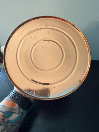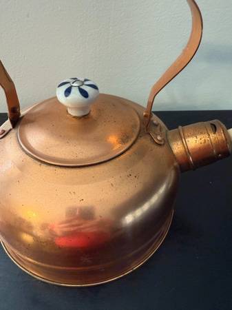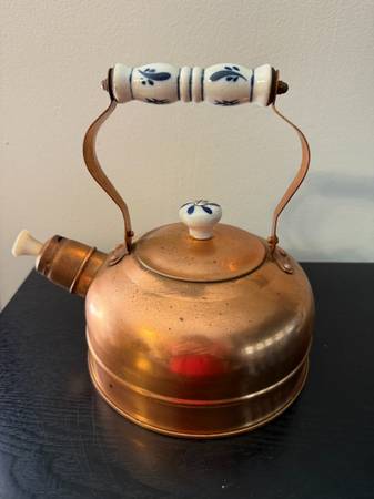 Wonderful vintage copper tea kettle with removable whistling lid and delft blue handles. Handle swivels to the side to fill. No dents, but has some aging patina on the copper. See photos. Perfect to display or use.