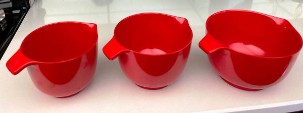 3 VINTAGE FIRE ENGINE RED COPCO MELAMINE NUMBER 672, 673, AND 674 MIXING BOWLS, 1 1/2 QUART, 2 QUART, and 3 QUART. Rubber base and bowls in perfect condition. Hardly used. Dishwasher safe. Original...