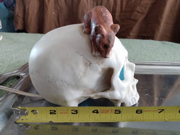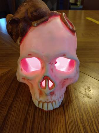 Pre-owned Halloween decoration of a Human Skull with a mouse sitting on-top of it's head. Made of ceramic and plugs-in. Cord has on/off switch. Cash price $10.00 firm. Please bring exact change....