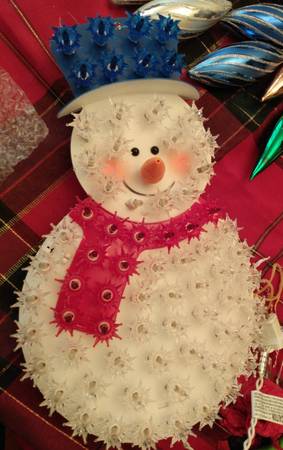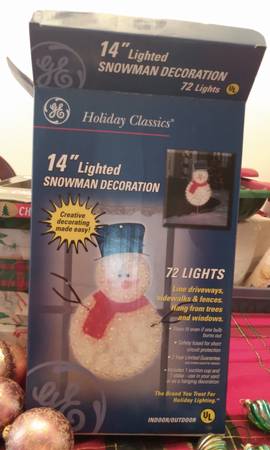 Pre-owned and very clean. A lighted Snowman decoration for your window or outdoors. The colors are red, white and blue. Having 72 bulbs in this compact size, makes this very merry and bright.