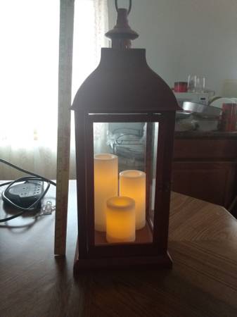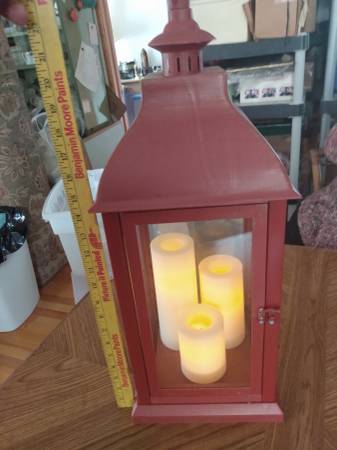Pre-owned and used is this plastic Lantern with 3 flameless LED candles in varying heights. Lantern measurement to the top of the window/door frame opening is 14" but to the very very top it's 22"...