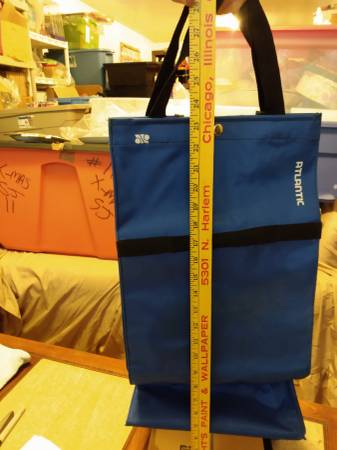 Pre-owned. Nylon Shopping Bag on wheels color Blue. No tears or damage. Cash price $10.00 Please bring exact change. Thank you.