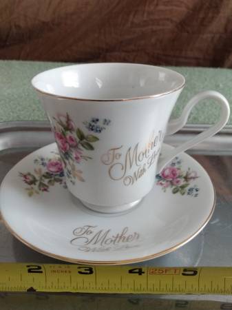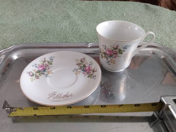 Pre-owned, very clean cabinet displayed. Porcelain Cup and Saucer decorated with flowers addressed "To Mother". Cash price $8.00 Please bring exact change. Thank you.
