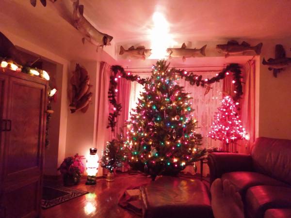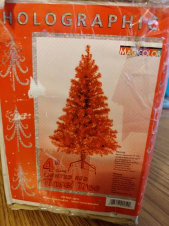 Selling a pre-owned artificial vintage 4 ft. Red Christmas Tree. Very Clean. Made of metal with red tinsel branches and red lights. Has its own stand. Box is damaged. Great Value!