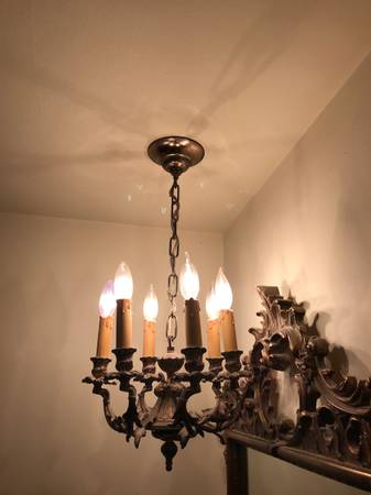 Excellent condition working vintage chandelier measures 13” H from tip of bulbs to bottom and is about 12”W. It is cash on pick up only. Please call or text .
