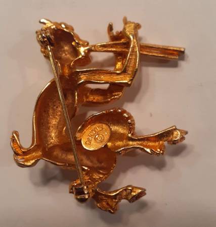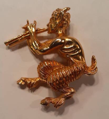 This is a rare figural gold tone brooch of a mythological Faun. The Faun is a goat man and in Roman mythology it is a creature with goat legs ad horns but the rest is human. The Faun is a symbol of fertility. It is stamped Di Nicola and is 1 3/8” by 1 ¾”. Pickup or $9 priority shipping and handling within the continental US with payment via cash, check, Zelle, Chase QuickPay or the Cash App