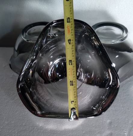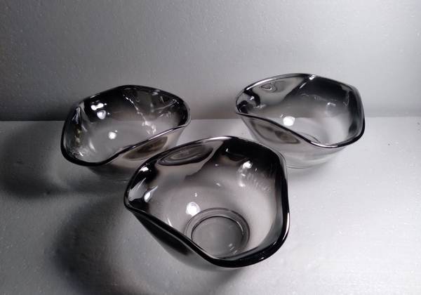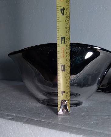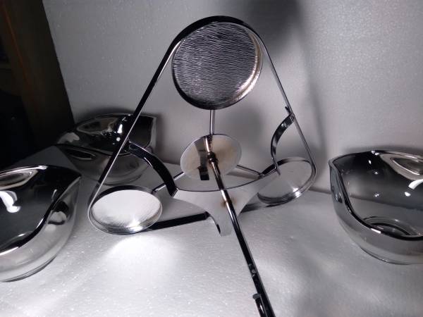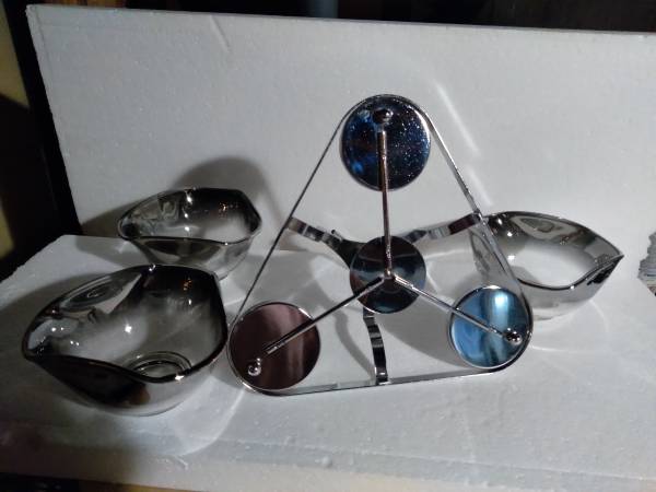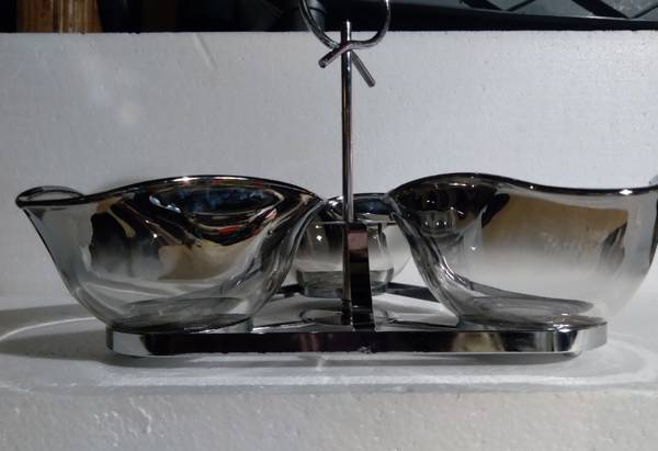 This condiment set / relish tray includes 3 ombre glass bowls and 1 silver colored carrying caddy / carrying tray with a silver colored handle. The glass bowls have a faint silver accent which fades into the clear glass beneath. Please see photos for more condition details. Cash only. Thank you.