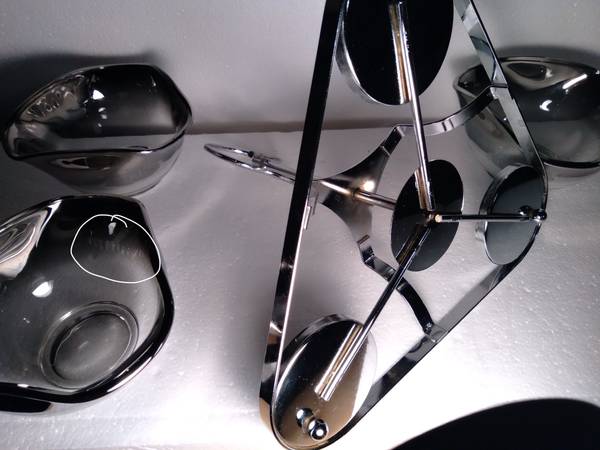 While this vintage set is very pretty, and pleasing in form, it is by no means in perfect condition. I have pointed out SOME of the most visible flaws, scuffs, but not all. Please see photos. Overall, a nice style addition to your MCM serveware, or barware collection.