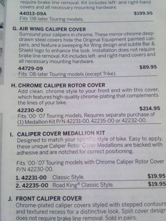Harley Davidson motorcycle chrome enhancement items. All mount on front end to cover the brake rotors, calipers, and lower sliders with gleaming chrome and lights.