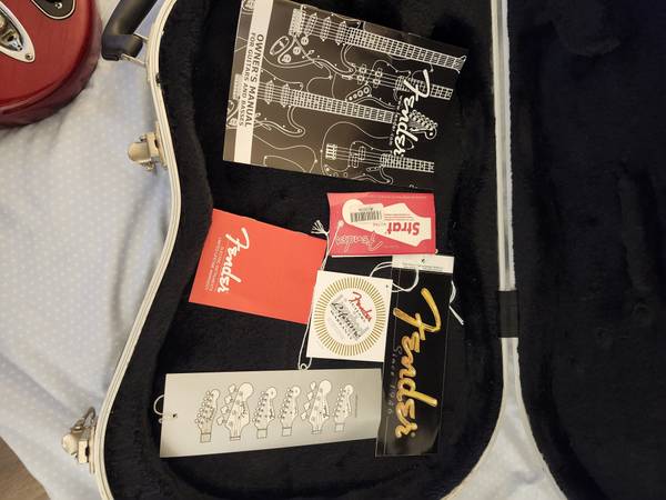 2004 FENDER USA STRATOCASTER 50TH ANNIVERSARY GUITAR. DARK RED FINISH. BLACK PICKGUARD. ROSEWOOD FINGERBOARD. 3 SINGLE COIL PICKUPS. 5 WAY TOGGLE SWITCH. SINGLE COIL/DOUBLE COIL SWITCH OPTION. HARD SHELL FLIGHT CASE. CASE CANDY. IN EXCELLENT/AS NEW CONDITION!!! WAS OVER $2000. NOW ONLY $1499 OR BEST OPTION. "CALLS ONLY" TO show contact info