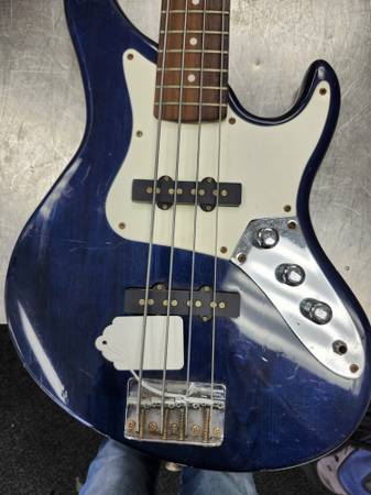 FENDER PRECISION BASS GUITAR BY ARCHER. BLUE FINISH. WHITE PICKGUARD. ROSEWOOD FINGERBOARD. 2 PICKUPS. 4 STRING BASS. IN EXCELLENT CONDITION. JUST HAD A SETUP WITH NEW STRINGS ($100)!!! WAS OVER $300 WITH TAX AND SETUP. NOW ONLY $99 OR BEST OFFER. THAT'S 1/3RD PRICE!!! A SAVINGS OF OVER $200!!! "CALLS ONLY" TO show contact info