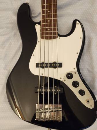 FENDER 5 STRING JAZZ BASS. BLACK FINISH. WHITE PICKGUARD. ROSEWOOD FINGERBOARD. 2 PICKUPS. IN EXCELLENT/AS NEW CONDITION. WAS $700. NOW ONLY $349 OR BEST OFFER. THAT'S HALF PRICE!!! A SAVINGS OF OVER $350!!! "CALLS ONLY" TO show contact info