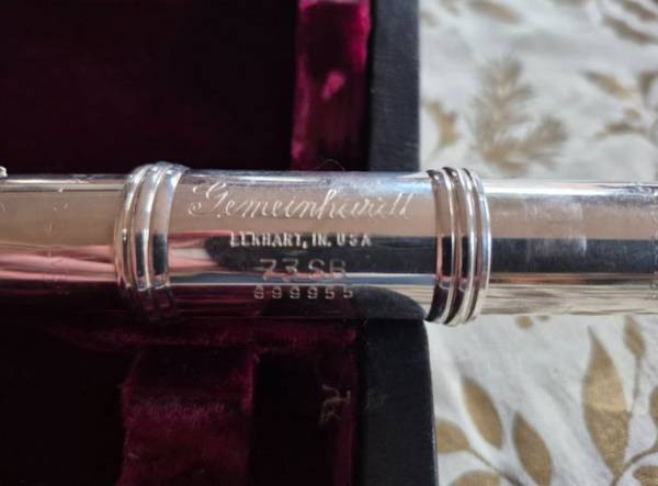 Gemeinhardt-brand, solid silver, 73SB, flute with cleaning rod, hard storage case, and soft carrying case. Very good condition. Based on serial number, manufactured circa 2004. Daughter no longer plays the instrument; it deserves a new owner who will love to play it.
