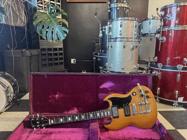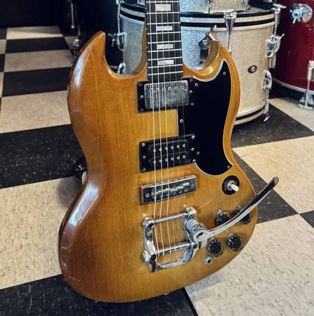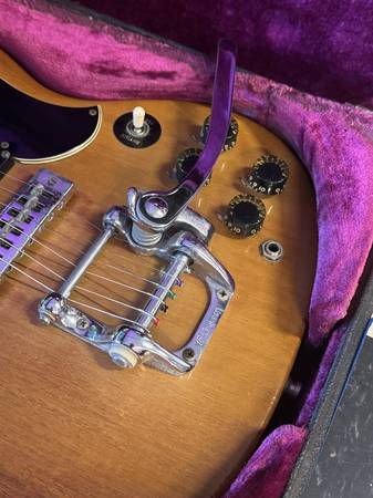 Description: Here's 1977 Gibson SG with very comfortable medium profile neck and the rare Gibson branded Bigsby tremolo bridge from the factory. The original "tar back" humbucker is detailed and great-sounding and the vintage Dimarzio gives this guitar punch and snarl when the bridge pickup is selected.