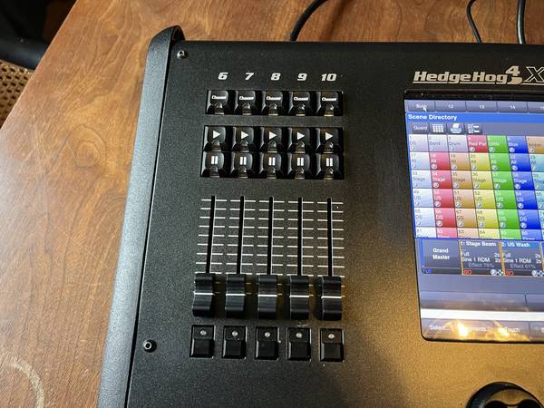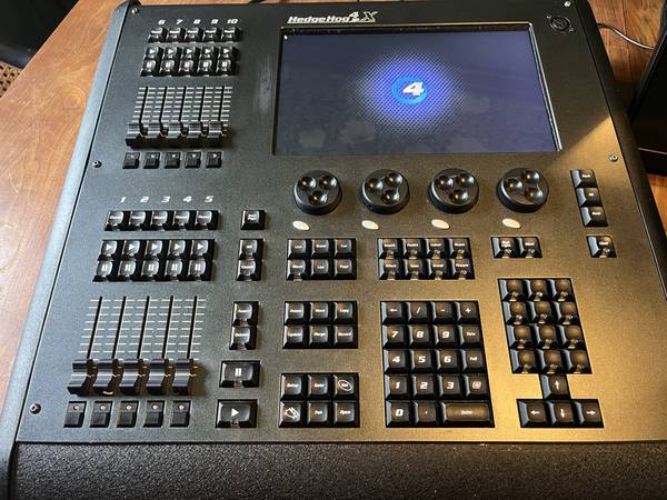 The HedgeHog 4X sports an internal 12.1” multi-touch monitor, ten faders, and four encoder wheels. The desk has full networking capabilities and 6 Universe output, and supports two external DP monitors.
