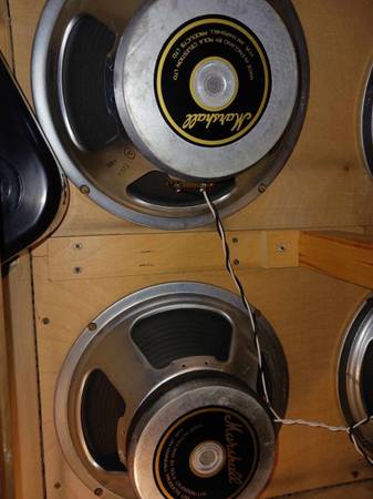 Matching quad of original Marshall-labeled (<--even more rare still) Celestion "T2876" G12-80's - bone stock and no issues, with "444" bass cone stamps. They sound perfect after all these years, not surprisingly -- that's one of the great things about higher-powered speakers. These are killer for guitar - fat, full, loud, and punchy. These are supposedly the "Appetite Slash speakers"... cool, cool.