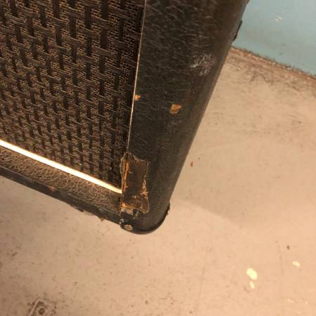 Cosmetically this cab has seen some stages, with the requisite dings and scrapes of a 45 year-old cabinet, and we see the original "small check" grill has been painted, as so many of this era -- overall pretty respectable grill with no major holes but some minor fraying. There's some dinged and missing tolex here and there but not terrible -- please see photos for the details. The side handles are nice and tight with no major cracks, the casters work and roll perfectly, which is nice. There are two extra small holes in the rear panel where someone in the past decided to run stereo at some point - again pretty common. Now wired back to mono with a newer jack and metal jack plate.