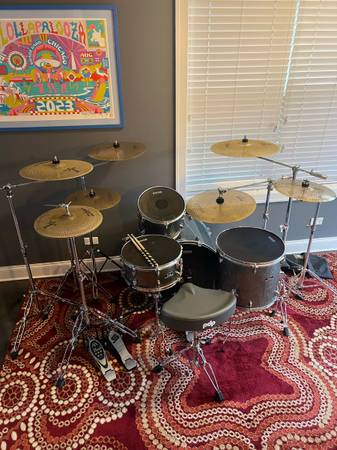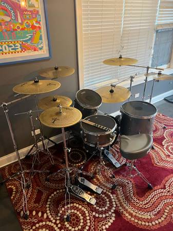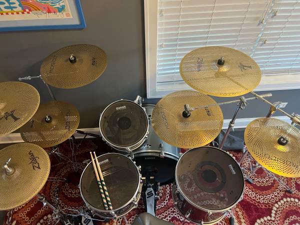 5 piece Pearl Roadshow with Evans DB-1 drum heads- 6 boom stands, double bass pedal, PDP drum throne, Zildjian L silent cymbals. 10 pairs of nylon tip sticks. All original drum heads included.