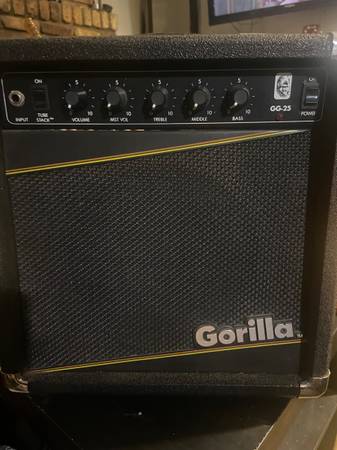 The Gorilla GG-25 is a vintage, 25-watt solid-state practice amplifier from the 1980s featuring an 8-inch speaker, a single channel with Gain and Master Volume controls, a 3-band EQ (Treble, Middle, Bass), a "Tube Stack" overdrive switch, a headphone jack, and a line out for connecting to a PA system.