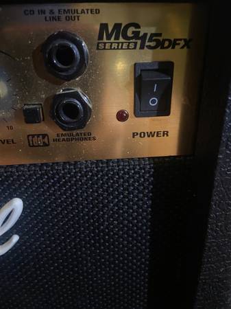 First amp is a Marshall MG Series 15DFX. (Shown without speaker, but speaker will be installed as well as back panel) When I went to turn this on, the light came on for about 15 seconds and then I heard a “pop” and it turned off. I couldn’t see any smoke or anything like that, but when I pulled out the amp it looked like there was a fuse (or something) that had burned out! This really looked to be an easy fix!!!