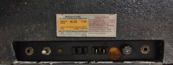 This is an extremely, extremely rare vintage amp and has restorable potential. It is one of the Magnatone Solid State amps and is probably from the early 1970’s. Both channels on the amplifier work and have decent volume but it needs some TLC. Only one position on the power/hum switch works. The pots need a little cleaning and a new set of input jacks probably wouldn’t hurt. It comes with the original Magnatone amp cover. The cover is in reasonably decent shape for its age but the zipper needs to be replaced. Having said all of that, I plugged-in a Fender Strat and was impressed with the warmth and punchy tone considering this is a solid state amp. I was told that the amp has a hum problem but I could not get it to do that. Besides, most amps only hum because they don’t know the words. There are no foot switches so I do not know if the tremolo and reverb work.
