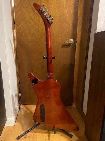 The Bradley line was then sold through Veneman’s Music Emporium Catalog. This Bradley explorer features a neck-through one piece mahogany body and rosewood fretboard with gold hardware. The body is 24.75” in length, with c-shape neck profile and 22 medium-jumbo frets.