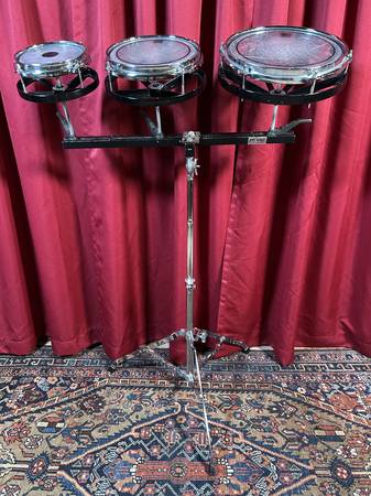 Set of Remo RotoToms. The 6", 8", and 10" drums are in very good condition with light signs of aging on the hardware. These drums have the second generation roto arm quick release, which indicates that they were manufactured after 1987. They tune up great, sound awesome, and are fully functional. The original Remo stand is also in overall very good condition with some aging and is included.