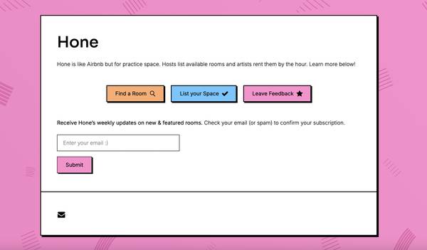 I’m building a community database called Hone to make it easier for artists to find affordable, convenient practice or rehearsal rooms (and for hosts to earn $ from spaces that would otherwise sit empty).