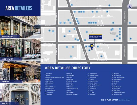 Join neighboring tenants Peter Millar, Peachy Studio, and Bella Biance Bridal Couture. Luxury area retailers include Aritzia, Rag & Bone, lululemon, and Tesla.
