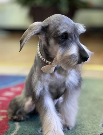 4 month old miniature schnauzer female pup. Good with other dogs and with kids Up to date on shots and was recently dewormed. I am asking a rehoming fee. Interested call me