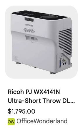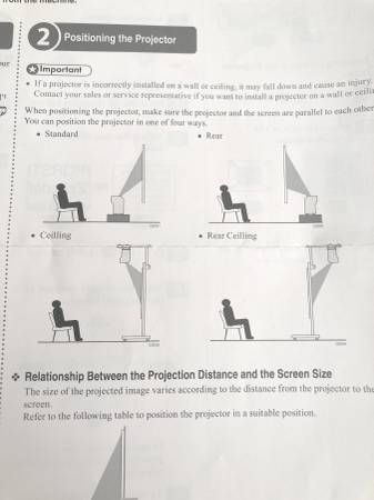 Ultra-short throw. See the diagrams. You put it very close to the wall/screen and it projects up from the floor or down from the ceiling.