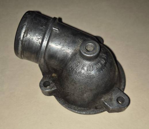 Used genuine aluminim Mercedes thermostat housing which fits various models. Do your research online to find out if it matches your car. Part # R 103 203 92 74 It's in good condition, ready for...
