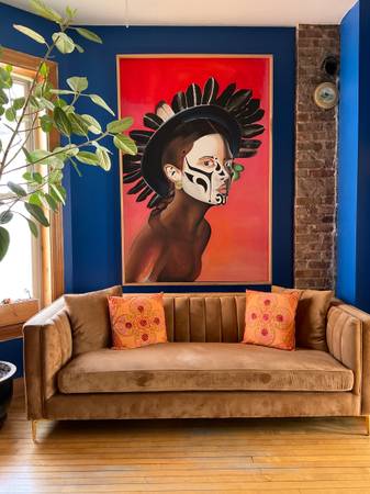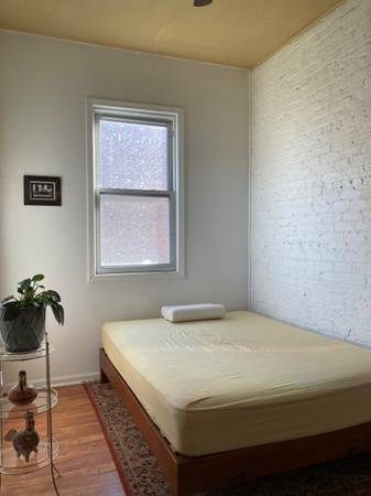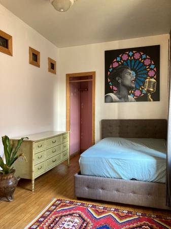 Fully furnished room available in a large modern loft-style artist apartment in the heart of East Humboldt Park. The apartment has three large well lit rooms and all brand new appliances. A three bedroom apartment each with closets. Would ideally want to share this beautiful space with someone who is responsible, easy going, and possibly artistic as well. The apartment has lots of natural light, a small library, and plants throughout. It is completely furnished, with a washer and dryer, all the needed household items, and a projector. Parking available next door.