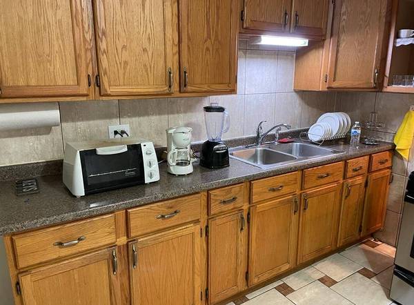 Living room, dining room, fully stocked kitchen, three bathrooms,