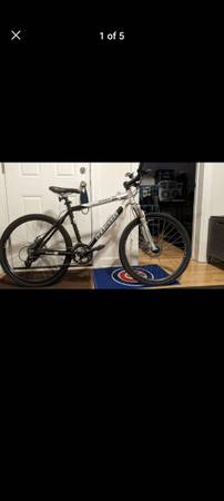 Lightly used mountain bike. Has a set of mountain tires and a pair of slicks. Also an indoor trainer that was never used and a car bike rack.