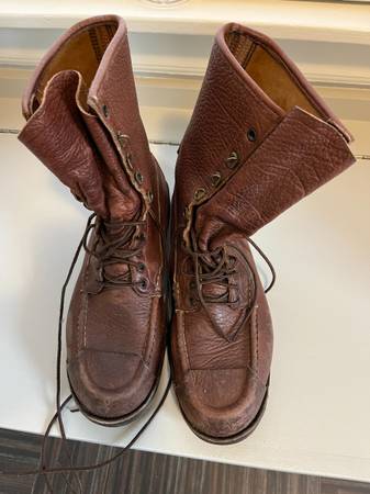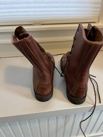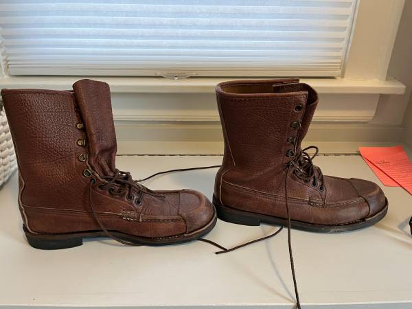 Hand-made rugged, extremely sturdy double vamp moccasin style hunting boots from WC Russell Moccasin Company, New Berlin, Wisconsin. The boots are used and in good condition, size 10½ B, with a heavy duty toe cap molded onto the last and cemented and stitched directly onto the midsole.