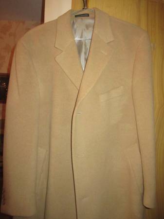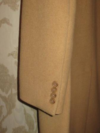 PREOWNED BEIGE TOPCOAT DRESS COAT 100% WOOL CAMEL HAIR 3 FRONT BUTTON CLOSURE 4 BUTTONS ON CUFF 2 OUTSIDE POCKETS 3 INSIDE POCKETS REAR CENTER VENT MADE IN DOMINICAN REPUBLIC CLEAN. PREOWNED LIGHTLY...