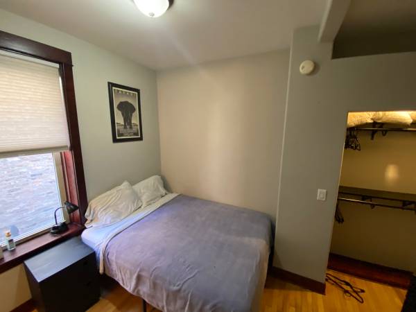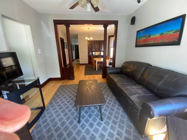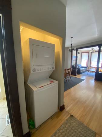 SHORT TERM, LONG TERM, NO PROBLEM. Prime location in Bucktown, 1st floor, high ceilings. 2 bedrooms plus bonus office/den. Beautifully refinished Maple floors, woodwork, built in hutch, columns. Primary bedroom has en-suite bathroom. Kitchen is updated shaker cabinets, stainless appliances and granite counters. Central Air and FREE laundry in unit. Easy access to Downtown, O'Hare via train, bus, car. Less than a mile to expressway entrance, 1.5 blocks to blue line. Awesome restaurants, bars, event spaces, parks, pools, etc, etc.