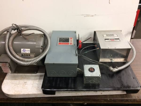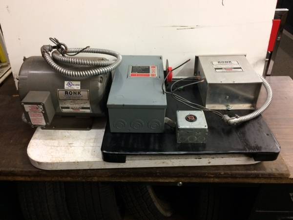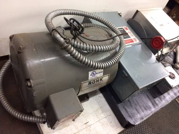 Rotary phase converter, RONK ROTO-CON /MARK II. The UL listed ROTO-CON is a dependable rotary converter that can operate a wide variety of equipment. Rotary phase converters flexibility in operating different loads make them an economical alternative to costly three-phase line extensions and their associated demand charges. They are easily installed , require minimal maintenance , and give years of trouble - free service. It is best suited for operating motors that do not operate continuously at high load levels or for non motors loads. Applications such as metal or woodworking shops, grain handling and milling, pivot irrigation towers, print shops, and food processing generally have these types of loads. This unit is like brand new , was in a store room of a tech school. SPECS. : KVA 10, VOLTS 240/480, HZ 60, TYPE. 5 horsepower. Also comes with 100 feet of heavy duty cable and a control box.