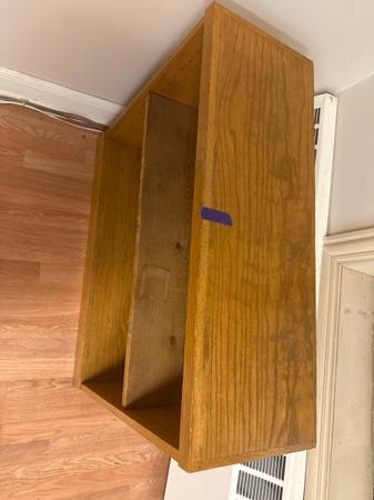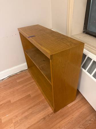 Selling a wooden bookcase. It features a simple design with two shelves, perfect for storing books or displaying decorative items. It's in good condition and ready for a new home!
