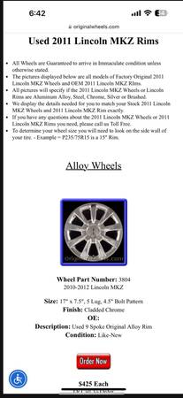 Used Lincoln MKZ 17” stock rims. Have scratches and scuff marks. Set of 4