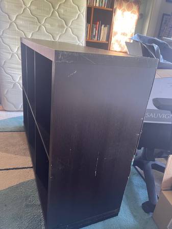 Free cabinet available for pickup. It’s a basic freestanding unit made of faux wood, with noticeable scratches and wear, but still sturdy and functional. Would work well for garage storage, basement organization, or other utility use.