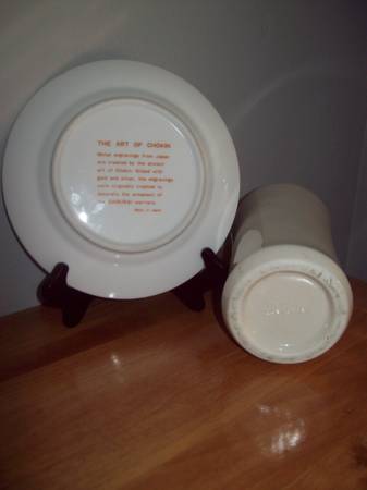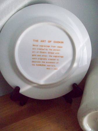 Made in Japan. These art of Chokin designs using many precious metals kiln-fired in Japanese porcelain are known for their intricate nature-inspired themes. The porcelain plate diameter is 6 1/4 inches. The porcelain vase is 6 1/8 inches x 3 1/4 inches diameter. $9 each.