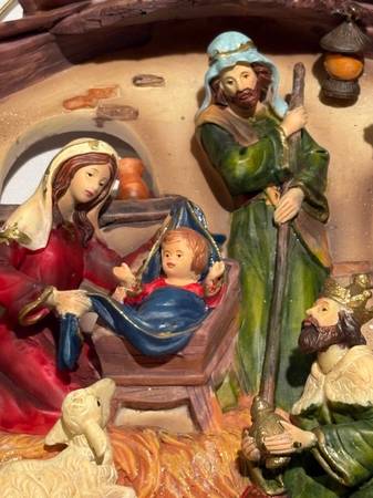 The 15.5"H x 14" W x 2.5"D Nativity features intricately hand-painted figures of the Holy Family, 3 Wise Men, and sheep gathered around the manger in a rustic stable. It is made out of resin and mounted on a gold metal sphere with stars and palm trees for beautiful 3D art. "Merry Christmas" inscription on the scrolled banner at the base. This largest Nativity scene is from St. Nicholas Square and was purchased in 2007 and stored in a box all these years. It has a hanging loop above the Star of Bethlehem and is $20.
