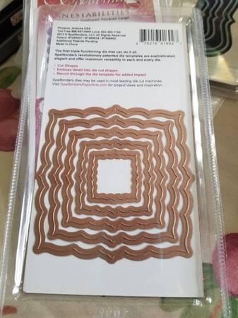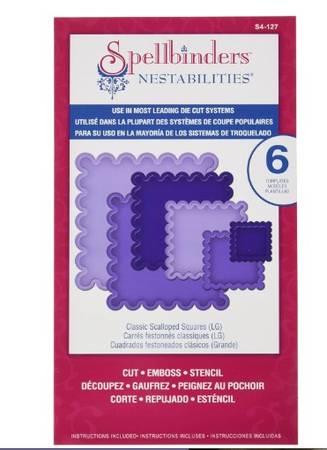 Scalloped Squares LG is a set of seven Nestabilities die templates. This set coordinates with many of the square shaped die sets by Spellbinders. NEW, smoke free home, never opened