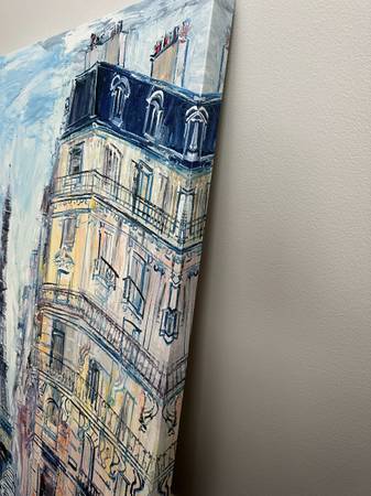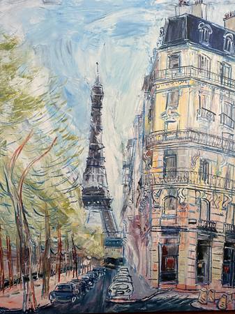 Parisian street scene revealing the Eiffel Tower. Artist is Jean Babtiste Oh. Gallery wrapped giclee, excellent condition, ready to hang. Dimensions: 33”x 40”.